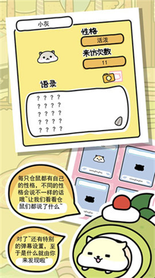 3、多维度收集图鉴:涵盖仓鼠品种档案、稀有服饰装扮、特殊事件相册三大收集体系,每完成特定收集目标即可解锁限定装饰物与纪念徽章。