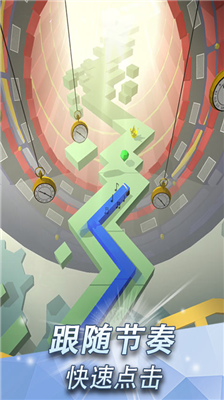 游戏包含12个主题章节与3个隐藏关卡,其中「风暴海洋」章节采用全3D视角旋转设计,玩家需在巨浪中完成三维空间路径判定。「霓虹都市」章节创新引入双线并行操作模式,两条旋律线需同时响应不同节奏型。每周更新的限时挑战模式会随机组合经典关卡元素,生成全新地图配置。