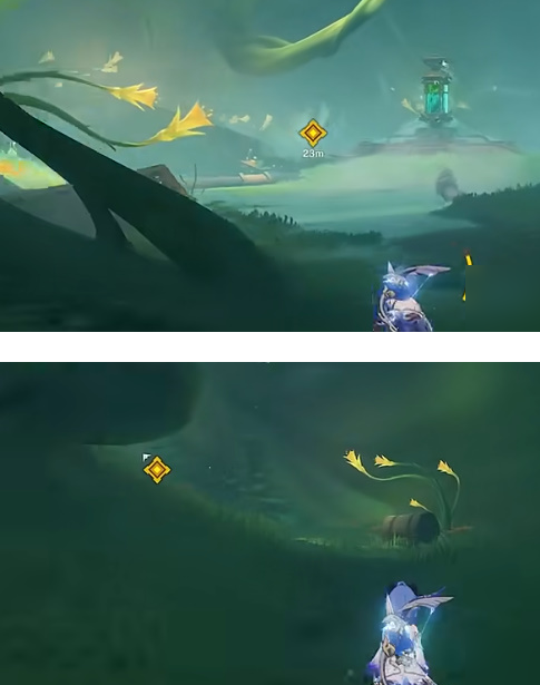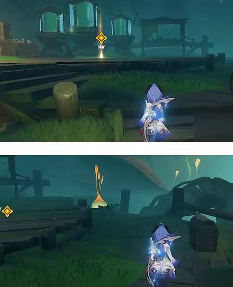 3、沿发光路径前进至T型岔路口时,右侧墙壁暗格内藏有精致宝箱,使用元素视野可发现隐藏互动点。